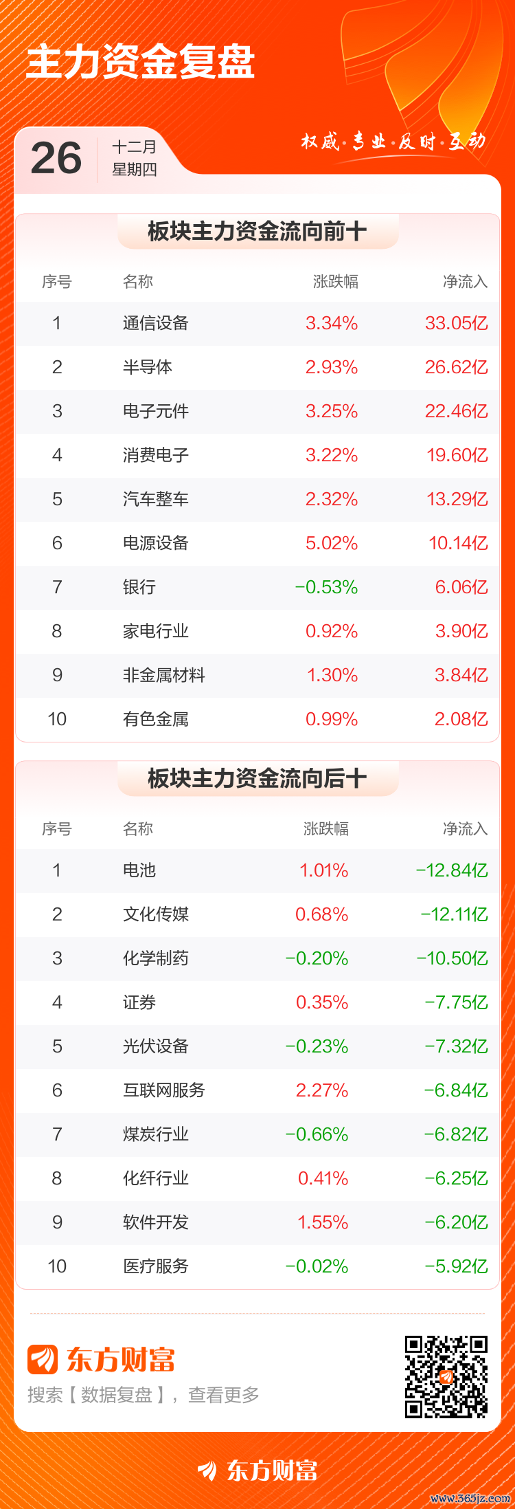 12月26日,沪指涨0.14%,深成指涨0.67%,创业板指涨0.39%。两市成交额1.27万亿,较上个交易日缩量88亿。数据显示,今日大盘主力资金净流出33.06亿。通信设备、半导体、电子元件等板块主力资金流入排名居前,其中通信设备净流入33.05亿元。